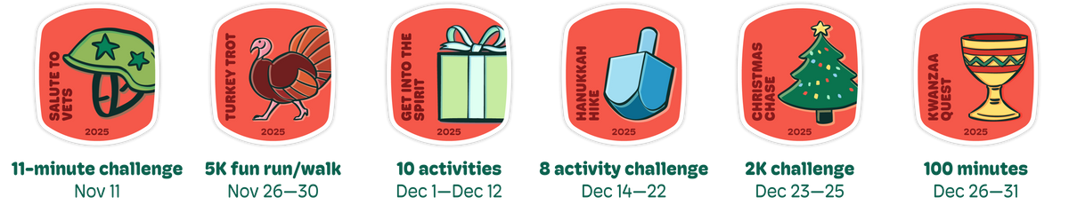 - Premium rewards — commemorative holiday hustle medal, super-soft tee, speckled 16oz ceramic mug, or set of 5 collectible pins